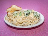 Fettuccine pasta in homemade creamy alfredo sauce with shrimp & broccoli, served with garlic bread.